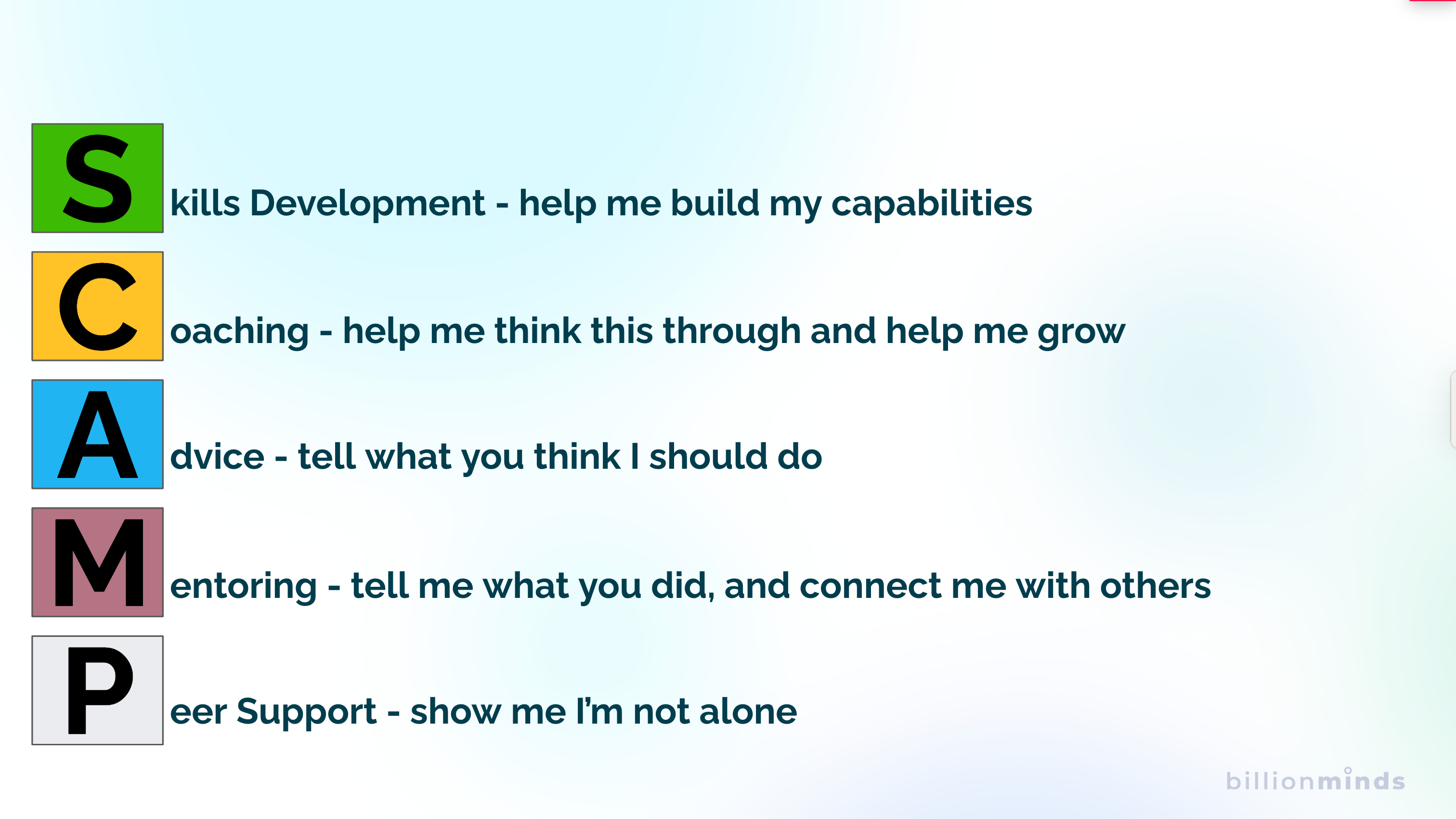 In our research, we have found that mentoring is a very important part of this picture, but still only one of five components, which we’ve put together in a model summarized by a handy acronym: SCAMP.