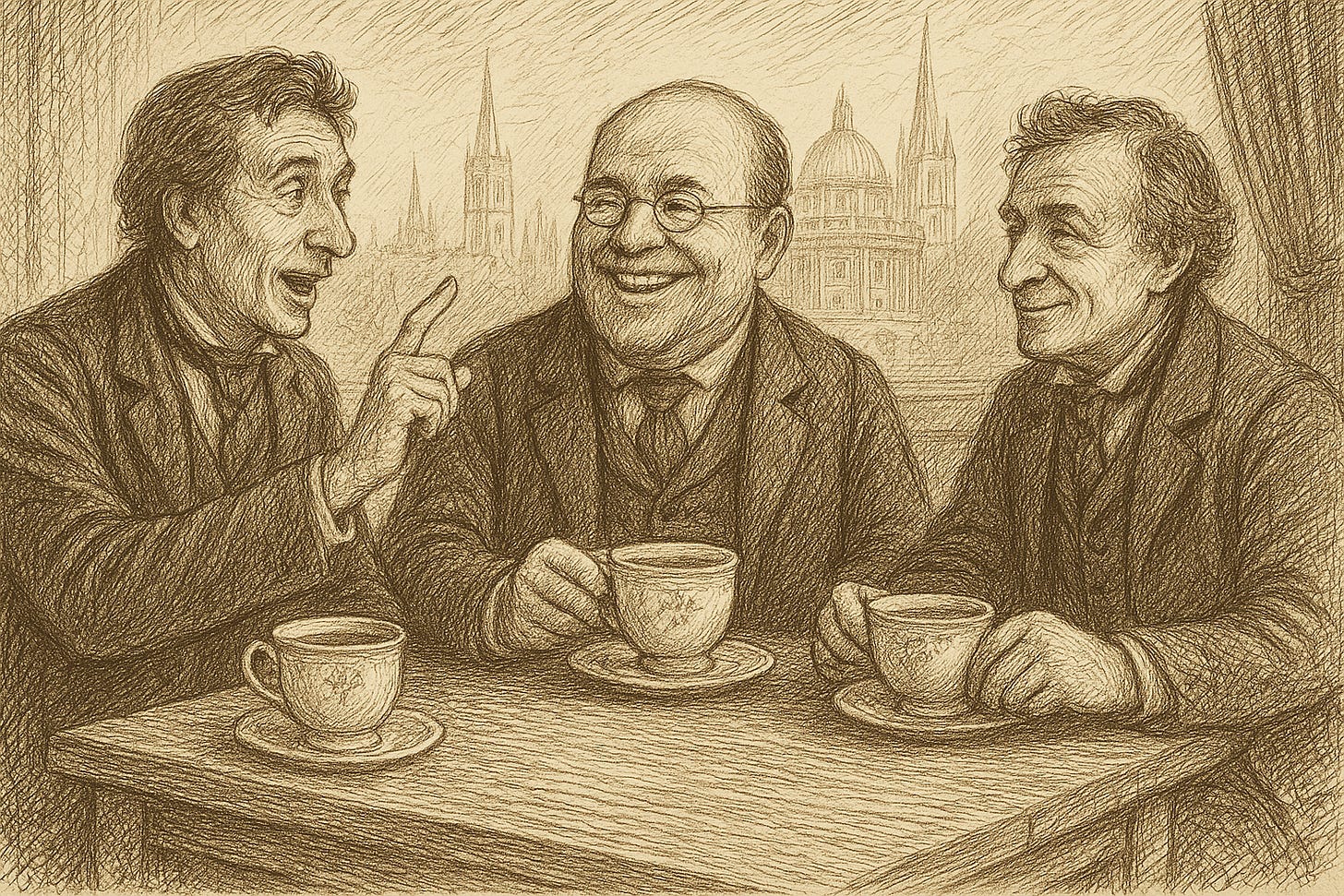 Oxford’s Grand Café, that venerable institution of the High Street, bore its years as a noble scholar often bears his: worn by time, weighty with learning, yet altogether rather magnificent. Brass fittings winked in the pale winter light, mirrors caught and multiplied the bustle of gowns and bicycles, and the strong scent of coffee clung to the air. At a corner table sat three regulars—Horace, Thomas, and Edward—engaged in earnest disputation, each holding his cup tightly before him, as though it were both shield and weapon in the fray.